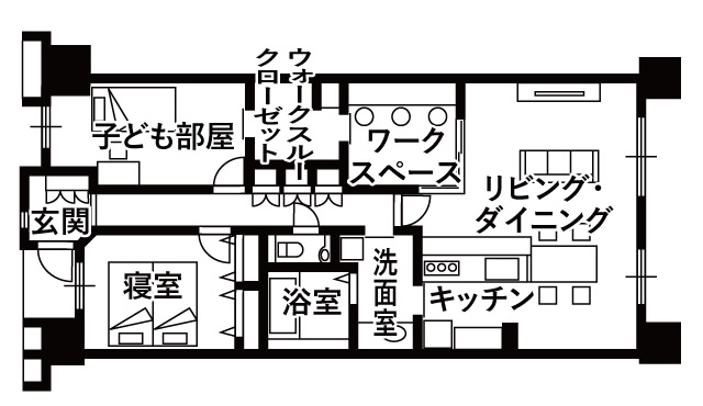 育児休暇明けの暮らしを見据え、中古マンションを購入しリノベーションされたM様。ゆったりした洗面室やベビーカーを置ける広い玄関、ワークスペース、そして念願の対面キッチンを実現。仕事も家族の時間も充実させる住まいが実現しました。