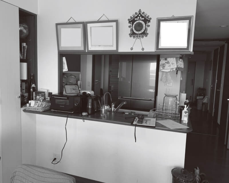 洗面室への出入口に壁をつくり、カップボードを新設。手前には調理家電を納めるスペース、奥には可動棚のパントリーを設け、収納を充実させました。