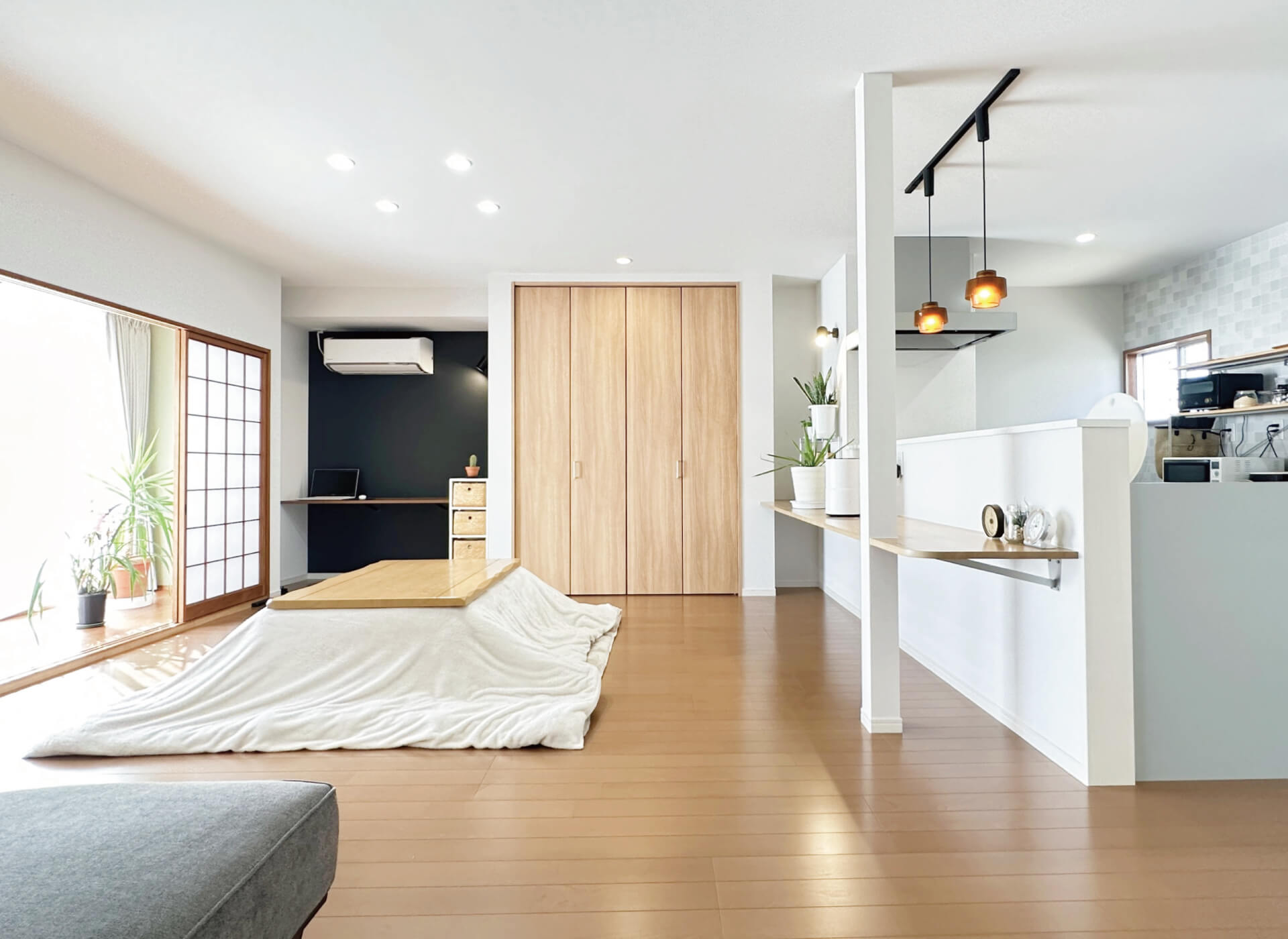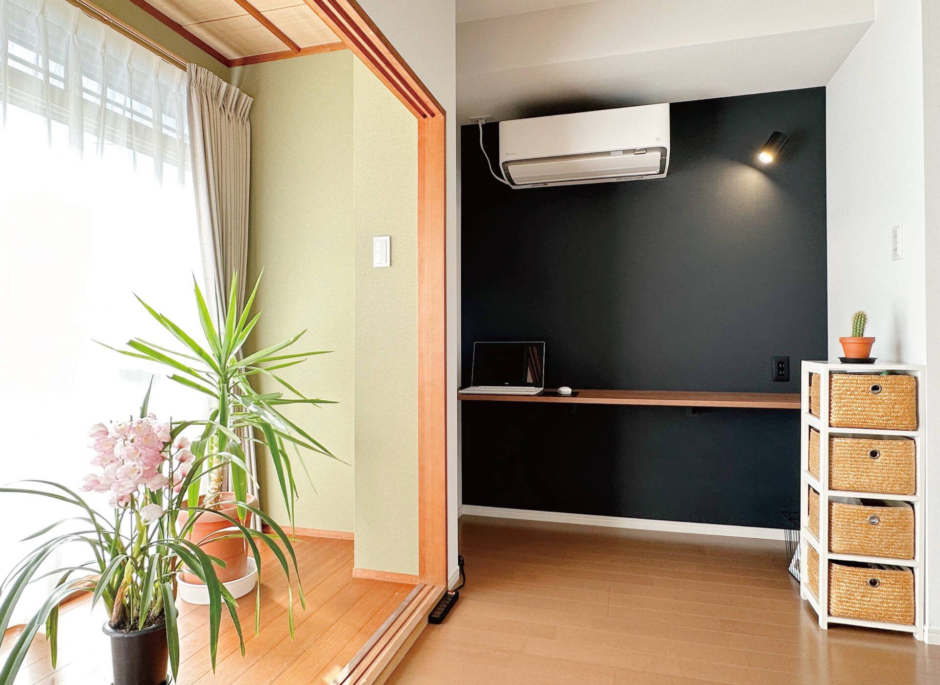 広縁の隣に、ご主人のワークスペースを新設。壁面をブラックにして、LDKのアクセントに。