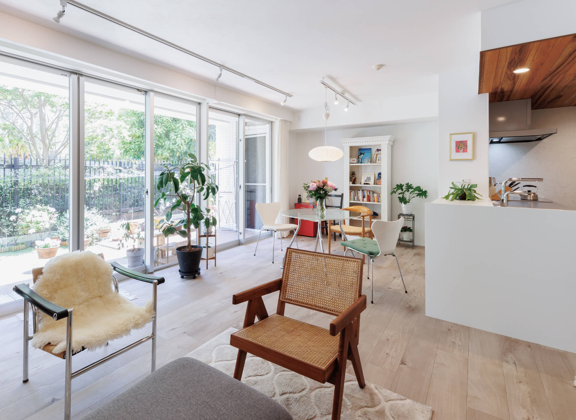 Y様夫婦と猫がのびのびと暮らせるように、水廻りの刷新を機に住まい全体をリフォーム。リビングと隣接する個室をつなげ、大きな窓から光が差し込む広々としたLDKに。アカシアの下がり天井がアクセントとなり、あたたかみのあるスタイリッシュな空間に仕上がりました。