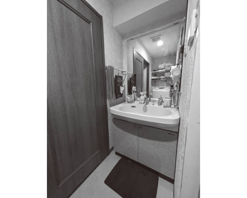 浴室と脱衣室の狭さに加え、住まいの傷みが気になっておられたA様。和室の押し入れスペースを取り込んで、ゆったり着替えられるランドリールームに。天井にはハンギングバーを取り付け、部屋干しができるようにしました。グレーを基調にしたヴィンテージモダンな空間です。