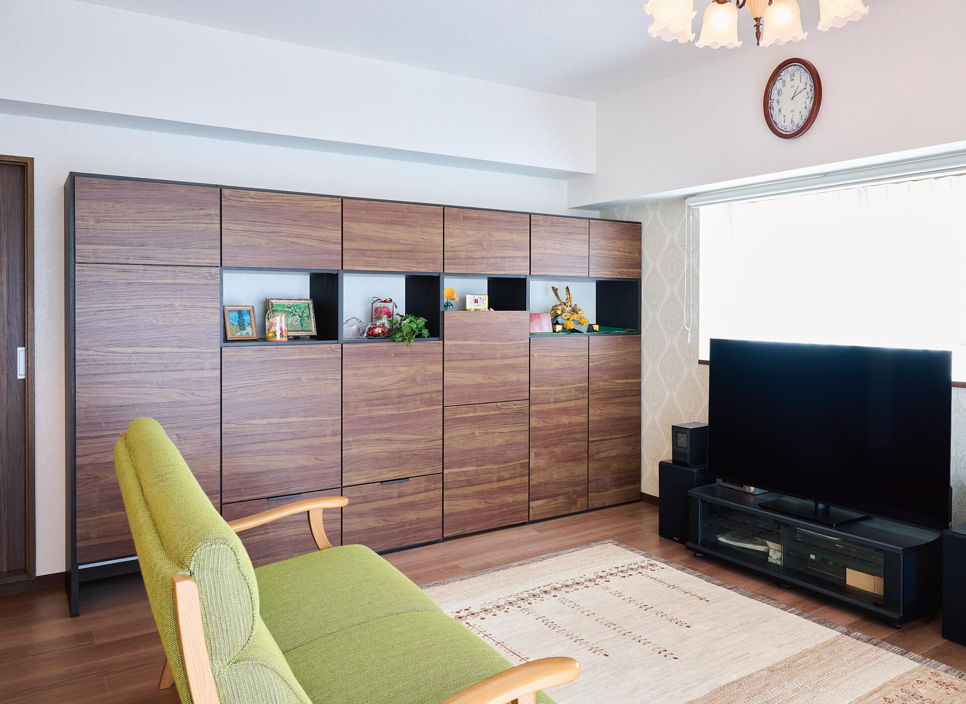 リビングの壁面収納は、落ち着いた色合いのウォールナット柄に。同時に木目柄の床材、淡いグリーンのアクセントクロスに替えて、やさしい上品な空間になりました。