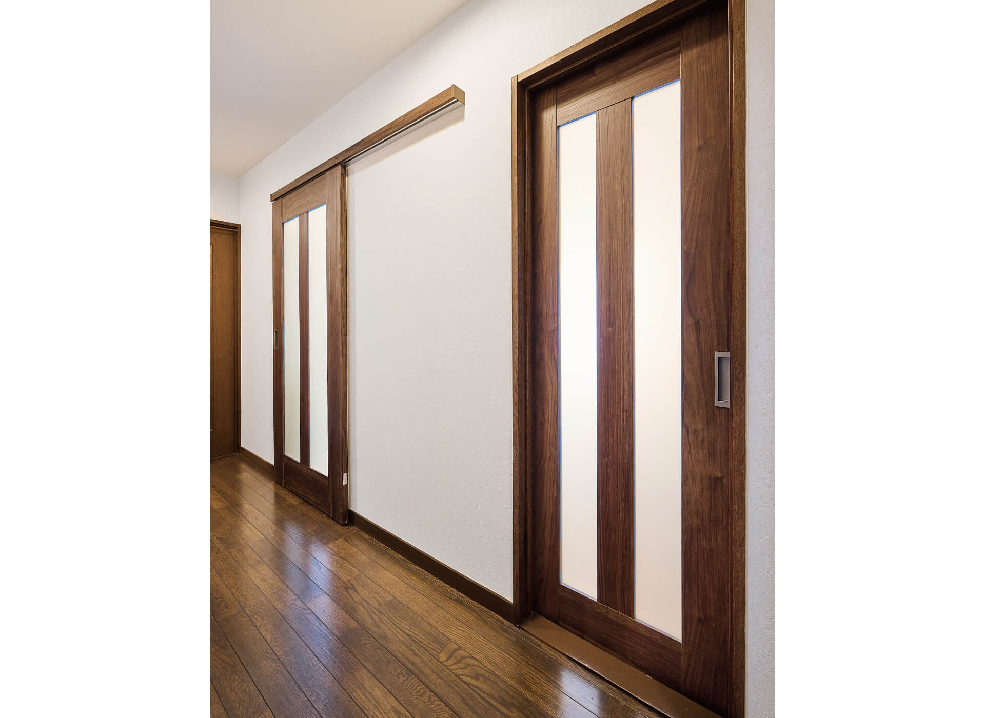 廊下とリビングの間を引き戸に変更し、開けたままでも快適に。玄関が明るくなるように、採光タイプを選びました。