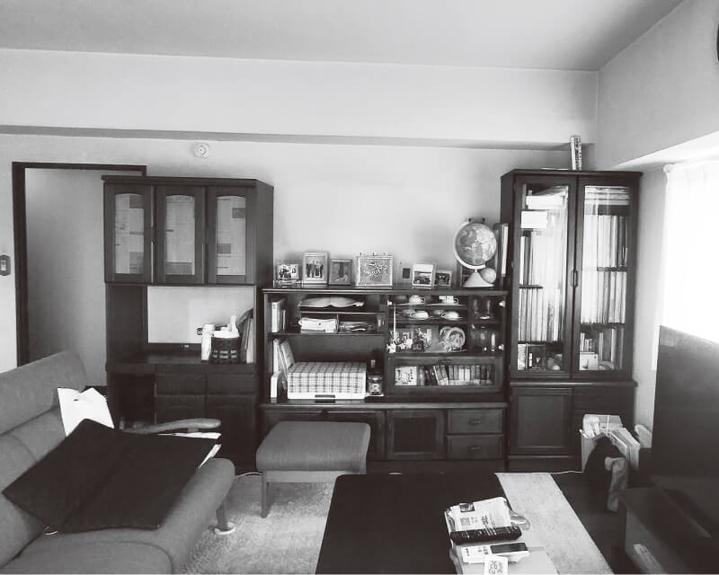 家具を壁面収納に変えて、すっきりと片付いたリビングにリフォーム。床と壁も替えて、心地よさと使いやすさを両立。長く暮らす中で増えたものをスマートに収納でき、リビングをキレイに保てるようになりました。
