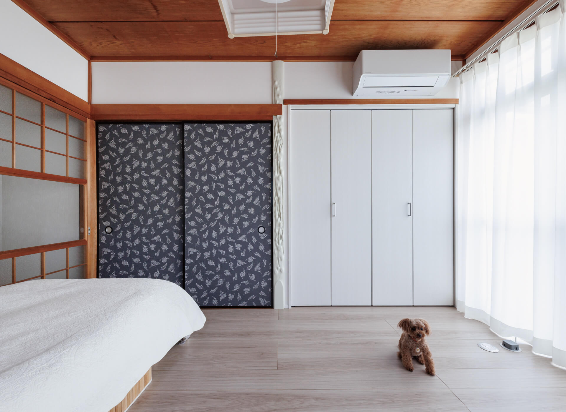 天井と床柱は残したまま、床材やクローゼットを改修した寝室。古い部材にも合うクロスや建具を選び、和モダンな空間になりました。