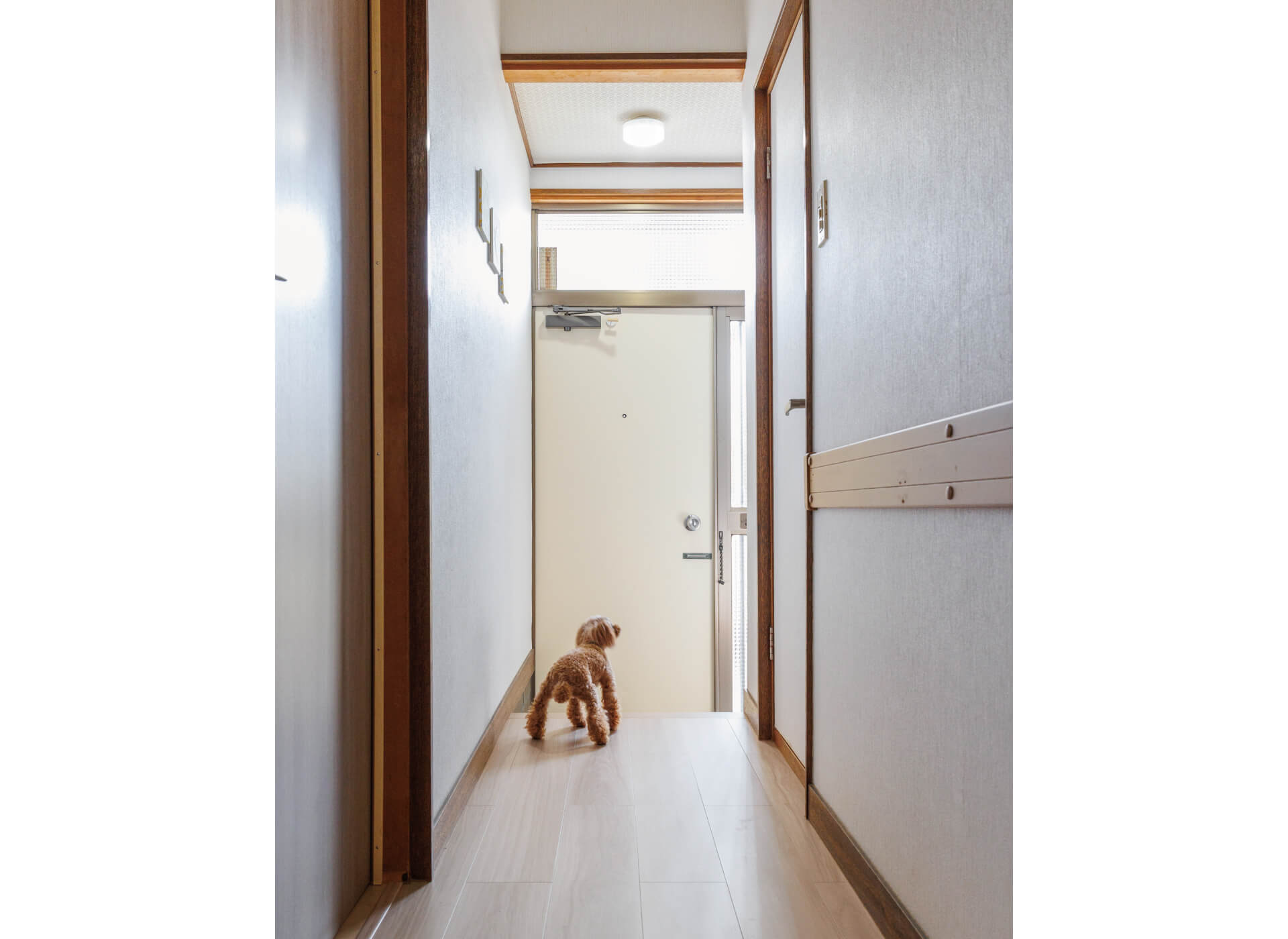 玄関へと続く廊下も、滑りにくい床にリニューアル。犬の身体への負担が少なくなったので、安心して見守ることができます。