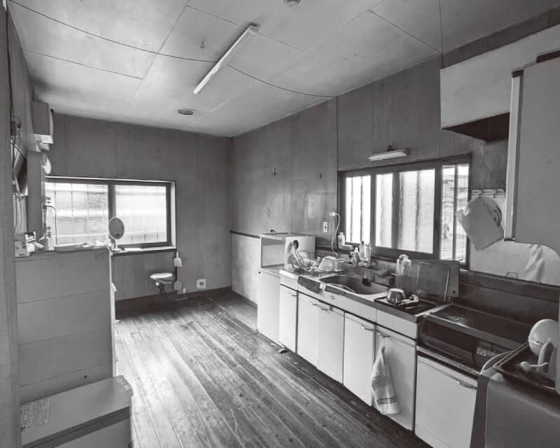 窓や天窓からたっぷり光が差し込む明るいキッチン。昭和のレトロガラスの引き戸や窓を活かして、どこか懐かしさを感じる空間を演出しています。
