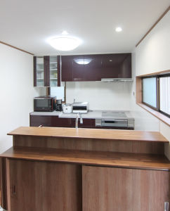 L型キッチンからⅡ型キッチンへ変更。カウンター付き収納を造作し、十分な収納を確保しました。