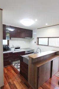 ダイニング側の吊度を無くし、開放感のあるキッチンへ変身。ご家族の顔を見ながら楽しく料理が出来ます。