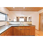 吊り戸はなくし家族が見渡せるようにしました。L型の作業スペースは広々使え、4世代一緒に料理が楽しめます。