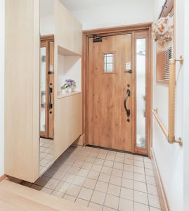 飾り棚付きの玄関収納。お出かけ前にさっと身だしなみをチェックできるミラーが便利。