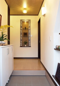 快適さを追求するだけでなく、家族の歴史や思い出も大切にしたいとお考えだったM様。お父様との思い出が詰まった照明器具は、ご主人がぴかぴかに磨き上げ、玄関で再びあたたかな光を放つように。また、アジアへの赴任中に奥様が集めた布や小物が飾れるスペースも設けました。二人の思い出や家族への想いがいっぱいに詰まった新しいわが家で、お二人の心豊かな暮らしが始まっています。