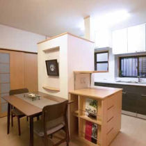 家事を時間差で行うことが多い二人姉妹のI様は、IHクッキングヒーターの魅力を展示会で実感しリフォームを決意。採用されたのは構造上抜けない柱を利用し、冷蔵庫を囲む「隠し壁」とアイランドカウンターを設けた回遊性の高いプラン。どちらかがキッチンで調理をしながら、一方はダイニングで食事をしたりくつろいだりと、ほど良い距離感を保ちながらコミュニケーションできる空間になりました。施工店: 城東建設株式会社