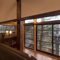 天井部は解体して勾配天井に。元来の梁組みと新たに造作した梁を組み合わせ、出迎えの場をシンボリックに飾りました。ワイドな天窓や高窓からは光が注ぎ込み、間接照明と相まって、演出効果を上げています。蹴込み板のない階段や、オープンな手すりで、縦への広がりだけでなく横への開放感までも創出しました。
