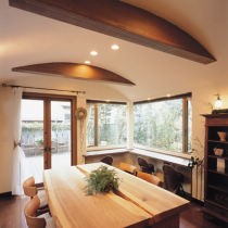 玄関を入るとすぐにキッチンが見えてしまうことも気にされていたため、玄関位置を変更。天井には既存家屋の天井材を再利用し、もともとの梁を残しながら新たに梁も加えて、迫力のあるダイナミックな空間に。建具のエクセルダーク柄に梁の色を合わせて塗装し、奥様がご希望されていた「大正ロマンのような雰囲気」を醸し出しています。正面の庭に面する大きな窓には断熱性能の高いペアガラスのサッシを採用して、美しい眺めと快適さを手に入れました。