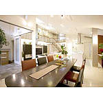 二世帯が夕食を採る食卓は、造作部材「インテリアカウンター」を使って特注で製作。キッチンの奥には家事室が設けられています