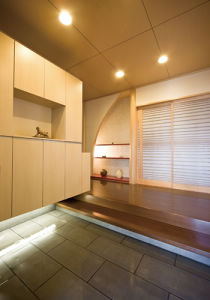 モザイク調の石張り壁を背景にした飾り棚。玄関収納のシンプルさが、飾り棚の意匠をより一層引き立てています