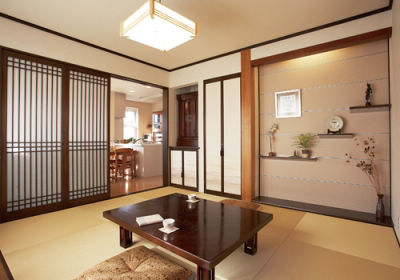 床の間には可動式の棚を設けお気に入りの小物を飾って演出。建具や畳もアジアンテイストに
