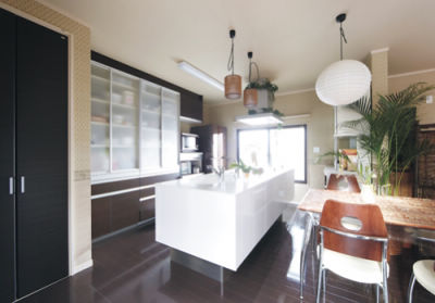 ダーク系の床にフロートタイプの白いキッチンが鮮烈な印象を与えるキッチン