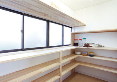 ぐるりと棚を配したパントリー。食品や小物類を大量に置けるので、キッチンはいつもすっきり