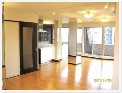 柱は構造上撤去できないので、鏡を貼ってデザイン性と実用性をアップ。ドアは濃い色の木目で床と合せて高級感が出るようにしました。南から入る太陽光が部屋全体に行きわたって明るくなりました。