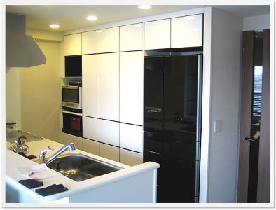 収納はパナソニックのキュビオスです。レンジや冷蔵庫が計算どおりに、スッキリと収まりました。扉は光沢のある鏡面のホワイトです。お手入れしやすく、汚れは水拭きでOKです。