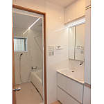 クロス貼りの壁に変えて暖かみが増しました。洗面台のサイドには天井まで鏡面パネルを採用。水はね汚れのお掃除も手間がかかりません。