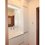 サイドには300幅のトール収納を採用したことで、並んでいた小物も収納することができ、すっきりした洗面台になりました。