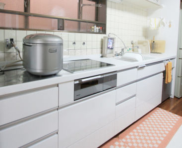 以前ガスコンロを使用されていたのをIHに変更。ガスより涼しく料理ができるようになり、お手入れも楽になりました。また冷蔵庫の横に仕切りを設けたことによりスッキリしました。