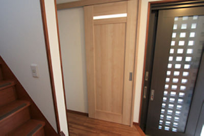 引戸を採用。入りやすくなりました。階段のでっぱりも車いすが通りやすいようカット。