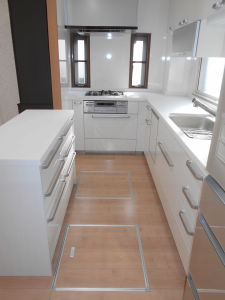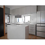 食器棚を撤去し、キッチンと同じLクラスのカウンタータイプのカップボードを採用。収納力もありアイランドとして使用でき、高さによる圧迫感もなくなったため、キッチン全体が明るくなった。