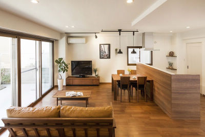 リビングが見渡せる対面式キッチン。背面には大きなパントリーを設けているので、キッチンはいつもきれいなまま。
