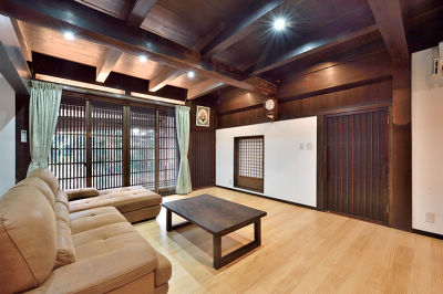 リビングのテーブルは床の間のケヤキの床板を再利用。以前の趣が随所に甦ります。