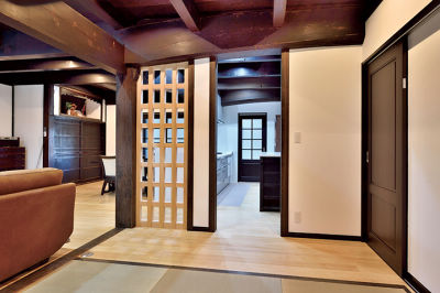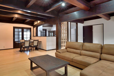 リビングのテーブルは床の間のケヤキの床板を再利用。以前の趣が随所に甦ります。