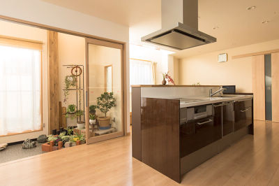 キッチンカウンターの背面は収納棚を造作。小物などを飾って見せる収納として、キッチン奥のパントリーと上手に使い分けます。