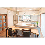 収納・回遊動線を考慮してレイアウトしたⅡ型アイランドのキッチン。シンク横にご主人が珈琲を淹れる広いスペースを。