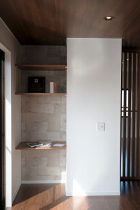 ダイニング横のカウンター 無機質なクロスでお部屋のアクセントに