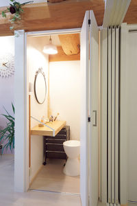 リビングの収納は、奥様のアイデアとご主人のDIYでパウダールームにアレンジ。お嫁さんお気に入りのスペースができました。