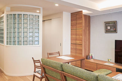 システムファニチャーで物が見えない収納を実現し、すっきり片付いたLDK。LDKとホビールームを緩やかに仕切る壁は、光が漏れるガラスブロック。