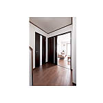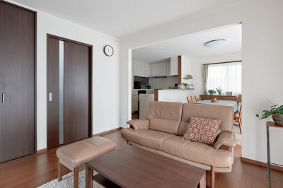 ドアと収納扉をウォールナット柄にそろえ、テーブルやソファーとコーディネイト。
