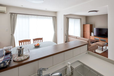 北側にあった閉鎖的な壁付キッチンを住まいの中央に移動。南向きでリビング全体を見渡せるキッチンに。広いデッキを新設し、外ともつながる明るく開放的なLDKを実現しました。