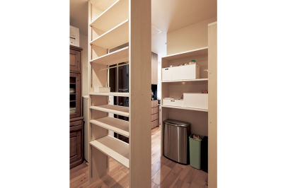 回遊できるウォークインパントリー。食品以外に日用品も収納できる広さです。
