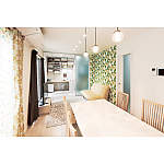 グリーンの壁紙が印象的なリビング。奥は間仕切りを開けるとつながる家事室。家事室とリビングの間に半透明の間仕切りを設置。閉めても、明るく圧迫感がありません。