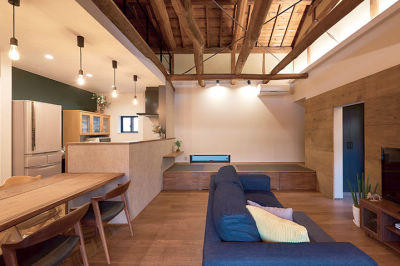 天井や梁など、以前の住まいの素材を残した部分をライトアップ。古き良きものを印象的に見せながら、LDK全体が心地よい明るさになるよう照明設計しました。