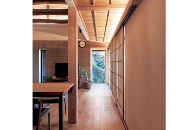 リビングの入り口から見て正面奥に、庭が見える窓を配置し、奥行きを感じさせています。正面の窓にまっすぐにのびる廊下の天井は昔のまま残しました。