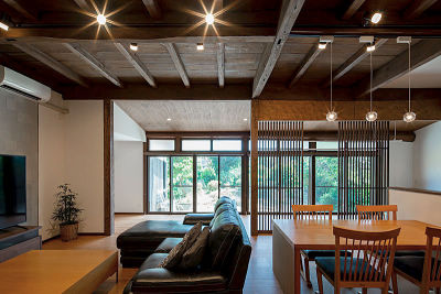 計画当初は2階の床組を見せる予定はありませんでしたが、解体時あまりにも素敵で趣のある床組が出てきたので、塞がずに現しのまま残すことをご提案しました。「みんなに褒めてもらえてうれしい。この天井がとてもお気に入りです」とE様。