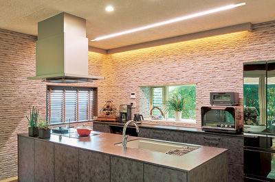 リビングとキッチンが一体化。大きな開口からは緑が見え、気持ちよく料理ができます。
