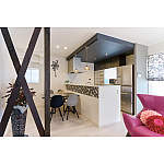 構造上残した筋交いとキッチンの下がり天井は色を合わせて、LDKのアクセントに。