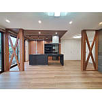 間仕切壁を無くして左右対称の筋交表しに。強度を保ちながらダイニングキッチン・リビングが繋がった広々デザイン空間に。