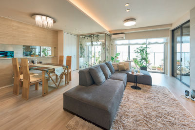 天井まであるガラス扉によりLDKのどの場所からも、緑あふれる景色を楽しむことができます。